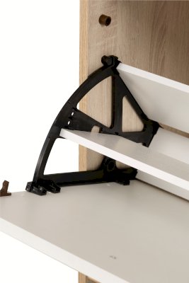 Ручки на створках выполнены из натурального массива дуба. Использование на створках псевдомагнитов позволяет сделать изделие комфортным в использовании.Ножки обувницы, выполнены из массива дерева, регулируются по высоте.