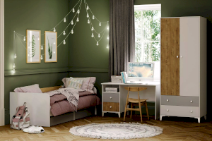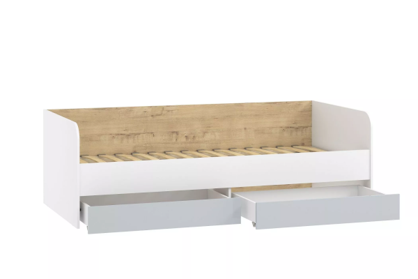 Односпальная кровать  подходит для детской мальчиков и девочек в современном, скандинавском и стиле лофт. В кровати предусмотрены ящики для хранения постельного белья или игрушек. Натуральный материал ламелей не вызывает аллергии и безопасен для здоровья. Изогнутая форма ламелей придает основанию спального места большую прочность и дополняет ортопедические свойства матраса.