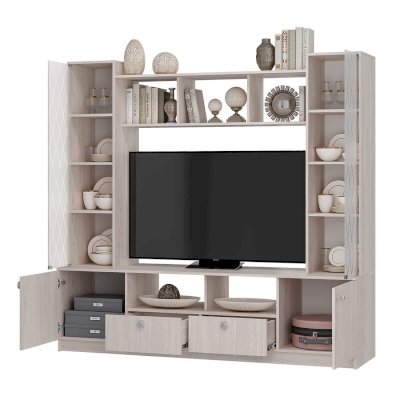 Модульная функциональная гостиная «Зарина», выполненная в классическом стиле, станет приятным акцентом в интерьере вашей квартиры. Спокойная древесная фактура цвета "ясень белый" делают модель изысканной и стильной. Стеклянные створки по бокам просторной зоны под ТВ придают визуальный эффект лёгкости и невесомости, подчеркивая изысканный вкус обладателя гостиной. Благодаря выбранному цвету пыли и грязи на ней совершенно незаметно, а это огромный плюс для домохозяек!