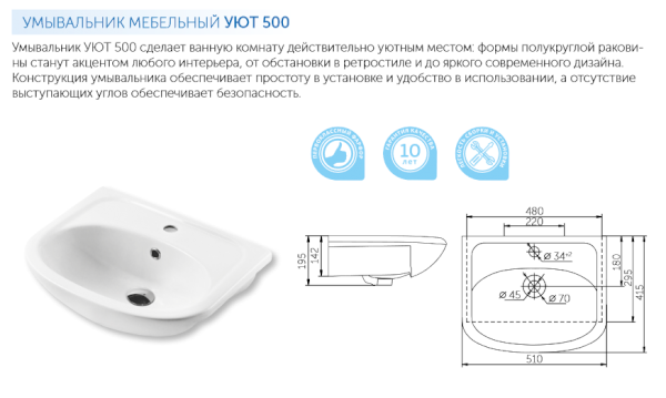 Компактные размеры никак не мешают пользоваться умывальником, он отличается удобством и практичностью. А разработанный со вниманием к деталям дизайн сделает его настоящим украшением ванной комнаты.