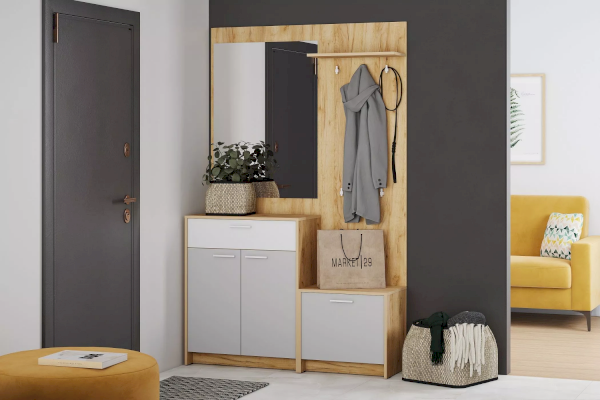 Тумба для обуви из коллекции НОРТОН выполнена в светлых оттенках, что визуально расширяет комнату, а контрастные тоны фасада придают помещению выразительность. Тумба представлена в двух цветах на выбор – Дуб Крафт Табачный и Дуб Крафт Золотой.