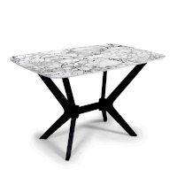 Столешница данного стола изготовлена из МДФ 16 мм, с применением фотопечати, рисунок которой защищен нанесением слоя специального лака. Одной из особенностей этого обеденного стола являются его ноги в форме крестовины. Это придает столу не только эстетическую привлекательность и индивидуальность, но и функциональность, так как данная форма ног гарантирует стабильность и прочность изделия.