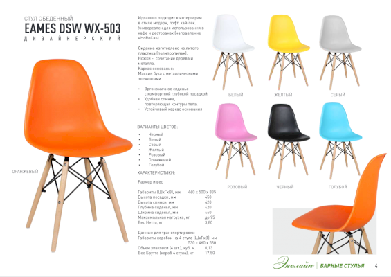 Дизайнерский стул EAMES DSW WX-503 - простая, но тщательно продуманная модель, идеально подходит к интерьерам в стиле модерн, лофт, хай-тек. Стул EAMES DSW выполнен из высокопрочного литого полипропилена с ножками из сочетания дерева и металла. Модель EAMES DSW органично впишется практически в любую среду дома и офиса, универсальный для использования в кафе и ресторанах (направление «Hpreca»).