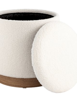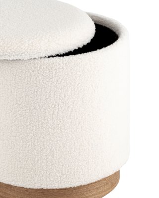 Лаконичный пуф в скандинавском стиле. Обивка выполнена из искусственного меха тедди - очень мягкий и приятный на ощупь материал. Прочный каркас из фанеры выдерживает на грузку до 150 кг. Основание из светлого массива дерева гармонично сочетается с белой обивкой. Пуф оснащен вместительным ящиком для хранения различный мелочей. Отличное функциональное дополнение для детской или спальни.