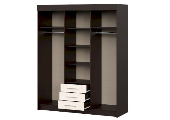 очень удобный многофункциональный шкаф купе с доп полками и выдвижными ящиками который ращделяется на три части что позволяет хранить вещи более удобнее