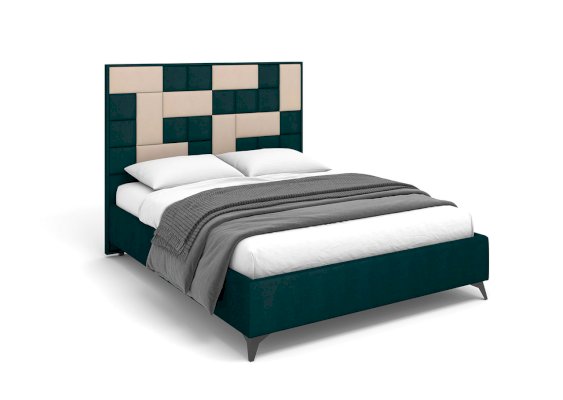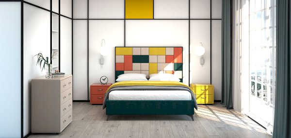 Необычная дизайнерская кровать со съемными мягкими панелями 2-х форм: квадрат и прямоугольник. Панели прочно крепятся с помощью липучки велкро к изголовью и позволяют создавать бесконечное множество комбинаций по цвету и форме.
