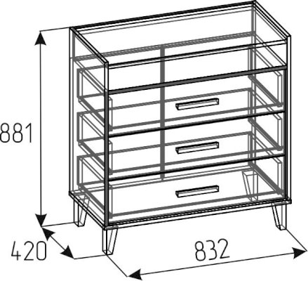 Комод Айрис 455 с нишей и 3 широкими ящиками на шариковых направляющих - выбор обладателей просторных спален. Благодаря его оптимальным габаритам (высота 881 мм, ширина 832 мм, глубина 420 мм), Вы сможете аккуратно хранить в нем все необходимое. Ящики выдерживают нагрузку до 10 кг каждый. Высота опор 120 мм дает возможность Вашему роботу-пылесосу беспрепятственно перемещаться по комнате в процессе уборки.