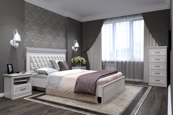 Корпус модуля выполнен из ЛДСП толщиной 16 мм, а в качестве украшения мебели применяется фигурный МДФ профиль. Ручки в цвете «античная бронза» синхронно отражают рисунок декоративного профиля и придают мебели выразительный вид.