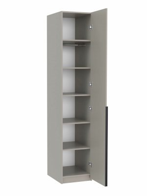 Распашной шкаф пенал имеет 1 дверцу с длинной профильной ручкой черного цвета. В комплекте идут полки (5 штук) и горизонтальная штанга. Это позволяет создать нужное наполнение напольному пеналу: он может выполнять функции бельевого, плательного или быть комбинированным (особенно актуально для детской комнаты, ведь одежда на плечиках не занимает много места и на оставшемся пространстве можно установить полки и положить туда другие вещи).