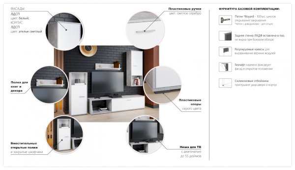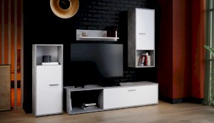 Мини-стенка «Лино» — это готовое бюджетное и функциональное решение, имеющее в составе всё необходимое для установки и использования в современной гостиной: открытые полки и закрытые шкафчики, большая ниша для телевизора. Дизайн в стиле эко-минимализм, строгая геометрия линий гармонизирует пространство, а нейтральное сочетание белого цвета с модной имитацией бетонного покрытия наполняет комнату простором и свободой, добавляет света и свежести.