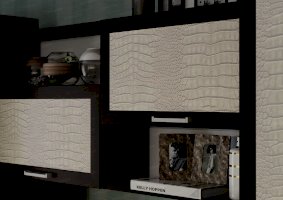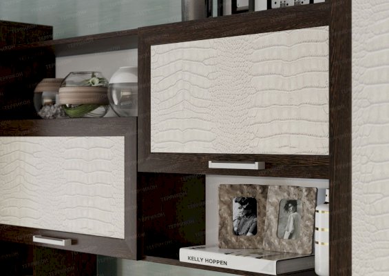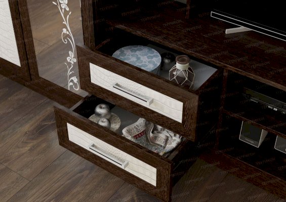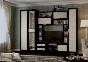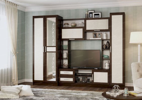 варианты цветовых решений Двухцветная гостиная «Флора-2» привлекает своей простотой и универсальностью. Беспроигрышная комбинация натуральных оттенков подходит абсолютно к любому цветовому оформлению интерьера. Изящный растительный орнамент на зеркале, несимметричность конструкции, а также поверхности фасадов с фактурой под крокодиловую кожу делают комплект стильным и уникальным.