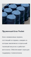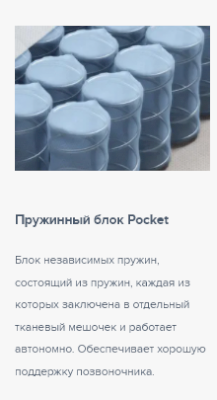 Матрас сделан на основе блока независимых пружин Pocket, плотностью 500 пружин на спальное место, снимает нагрузку с позвоночника и качественно поддерживает область поясницы. Современный гипоаллергенный материал Foam придает комфорт. Чехол матраса изготовлен из практичного и дышащего хлопкового жаккарда.