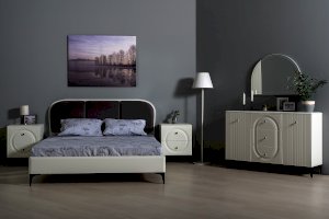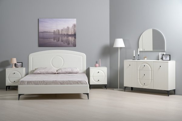 Вся лицевая фурнитура металлическая, графичное и стильное сочетание черного и хромированных деталей эффектно расставляет акценты на мебели. Основным декоративным элементом коллекции является круг, явно представленный фрезеровкой по фасадам тумбы.