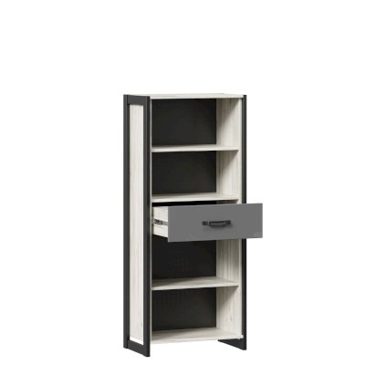 - Сверху за распашной рамочной дверью со стеклом ниша с 1 полкой из ЛДСП. Размер каждого отделения 524х265 мм. Размер двери 552х560 мм.