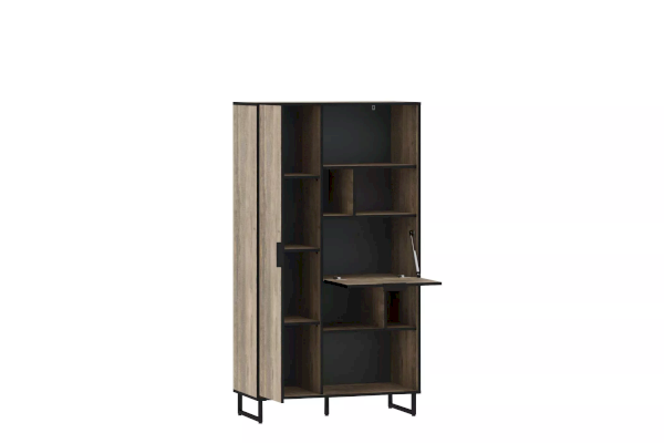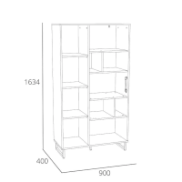 Шкаф оснащен распашной дверкой, которая закрывается мягко и легко за счет механизма с доводчиком, а газлифты фиксируют дверцу в открытом положении. Благодаря большому количеству закрытых и открытых ниш можно удобно расположить все необходимые книги и предметы интерьера, они не будут разбросаны в хаотичном порядке, а высокие опоры обеспечивают быстрый и комфортный доступ при уборке. Дополните шкаф стеллажом из одноименной коллекции, чтобы создать особо гармоничную атмосферу