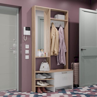 Компактная прихожая Тео – готовое решение для современной малогабаритной прихожей. Здесь есть все составляющие – зеркало с полкой для разных полезных мелочей, верхняя полка для головных уборов, просторная зона с крючками для верхней одежды, нижние открытые и закрытые полки, в которых можно хранить сезонную обувь. Регулируемые опоры позволяют установить прихожую на любой неровной поверхности. Высокое качество по приятной цене — это прихожая Тео.