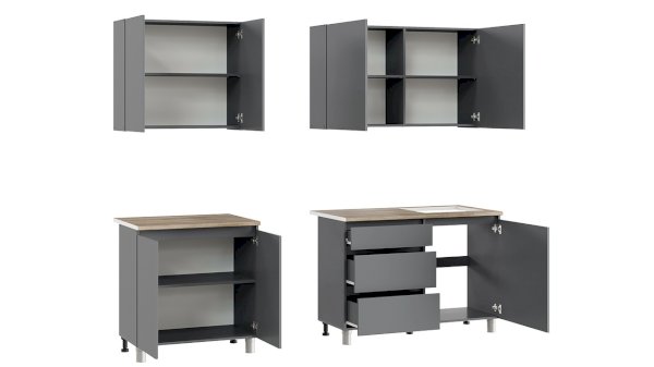 Сборка: нижнего корпуса шириной 1200 мм ящики всегда слева, верхних корпусов и стола 800 мм - универсальная