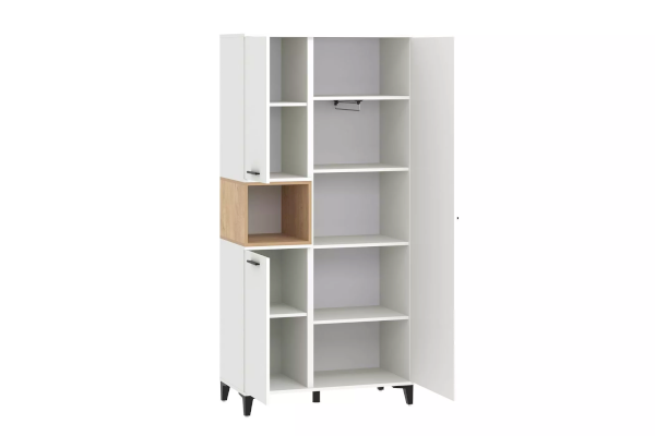 Шкаф оснащен полками за распашными дверками и открытой нишей, которая может быть собрана как на правую, так и на левую стороны, и в ней можно удобно расположить книги или элементы декора, а высокие опоры придают внешнюю легкость и обеспечивают быстрый и легкий доступ во время уборки.