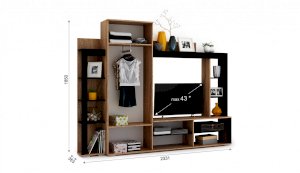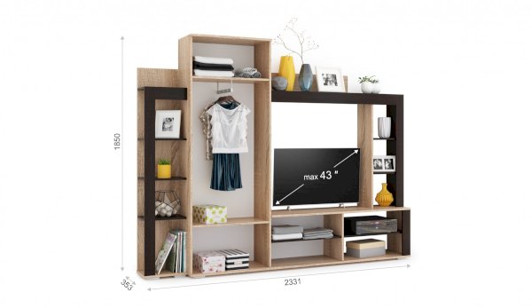 Гостиная Торонто - оригинальный дизайн, вместительность и небольшие габариты. Занимая мало места по глубине и ширине, она включает в себя платяной шкаф с штангой, нишу под ТВ и множество полок для приставок, колонок, книг и декора. Использование популярных цветов Дуб сонома и венге даёт возможность легко сочетать эту стенку в гостиной с другими предметами мебели – столами, журнальными столиками, стеллажами или комодами. Выполнена из экологичных материалов.