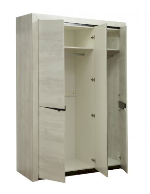 Данная модель – вместительней и функциональней двухдверного шкафа, так как имеет уже не два, а три внутренних отсека. И как еще один плюс – вариативность, ведь, как и двухдверный шкаф, данная модель предлагает вам выбор. И даже не один! Базовая комплектация состоит из трех отсеков – центрального, где две дверцы открываются навстречу друг другу, и отдельного отсека справа. И все три рассчитаны под одежду на вешалках. Штанга для вешалок выдерживает вес до 20 кг, каждая из полок – до 5 кг. Второй вариант – горизонтальные полки в центральном отсеке, и место для одежды на вешалке справа. Подойдет тем, кто предпочитает спортивный стиль и хранит одежду в основном в сложенном виде, а на вешалках располагает лишь небольшой базовый гардероб. Если же платьев и костюмов в вашем гардеробе больше, чем толстовок, джинсов и свитеров, подойдет третий вариант – центральный отсек со штангой, а справа – с полками.