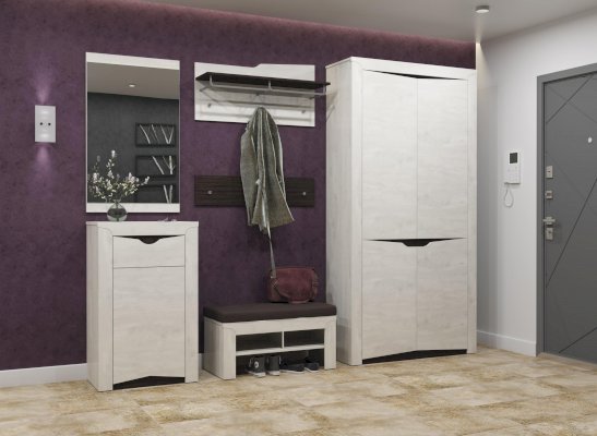 Двухстворчатый шкаф, в котором есть все необходимое, но нет ничего лишнего. Слева полки, справа место для одежды на вешалках. Сверху -  горизонтальная полка-антресоль, которая выдерживает вес до 5 кг.