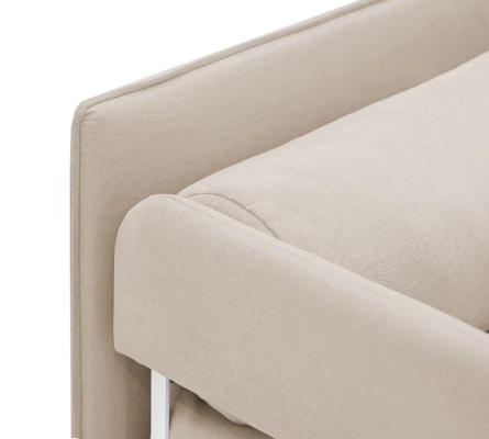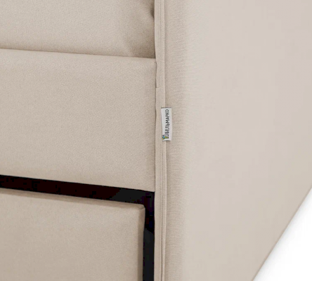 Каркас кровати изготовлен из ЛДСП класса Е1 16 мм. Боковые панели в кровати из ЛДСП, затем следует обивка, состоящая из слоя из водоотталкивающего микрошенилла, наполнение поролон 10 мм. Ткань обивки имеет водоотталкивающую пропитку. Если быстро удалить с ткани пролитую жидкость, то она не успеет проникнуть внутрь.