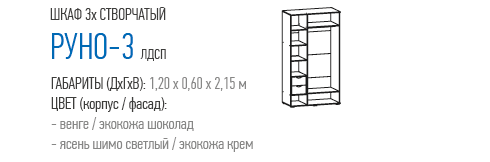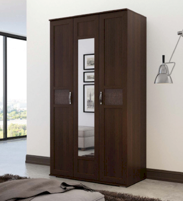 Трехстворчатый шкаф распашной «Руно-3» — эталон безупречного вкуса! Он смотрится благородно и презентабельно. Эффект элитарности достигается за счет высокого качества и особой фактуры отделки. Ламинированная ДСП оттенка венге выглядит как настоящий массив дерева. Глубокий коричневый цвет и древесная текстура создают ощущение комфорта и благополучия.