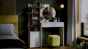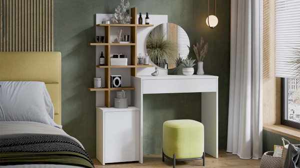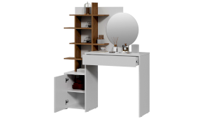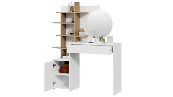 Помимо внешней привлекательности, стол достаточно вместителен. Конструкцией предусмотрено большое круглое зеркало, просторная столешница и практичный выдвижной ящик, который добавит места для необходимых мелочей. Стол также имеет открытые полки, которые позволят установить предметы декора, парфюм, украшения и многое друге.