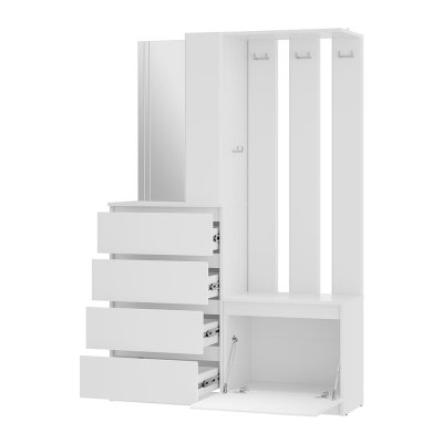 Под зеркалом в минималистичном дизайне — четыре выдвижных ящика, в которых можно хранить шарфы, шапки и другие нужные аксессуары. Еще одна нижняя полка подойдет для хранения сезонной обуви, а три открытых полки рядом с зеркалом — для ключей. Несколько крепких крючков для верхней одежды. Нижняя откидная створка - на кронштейнах.